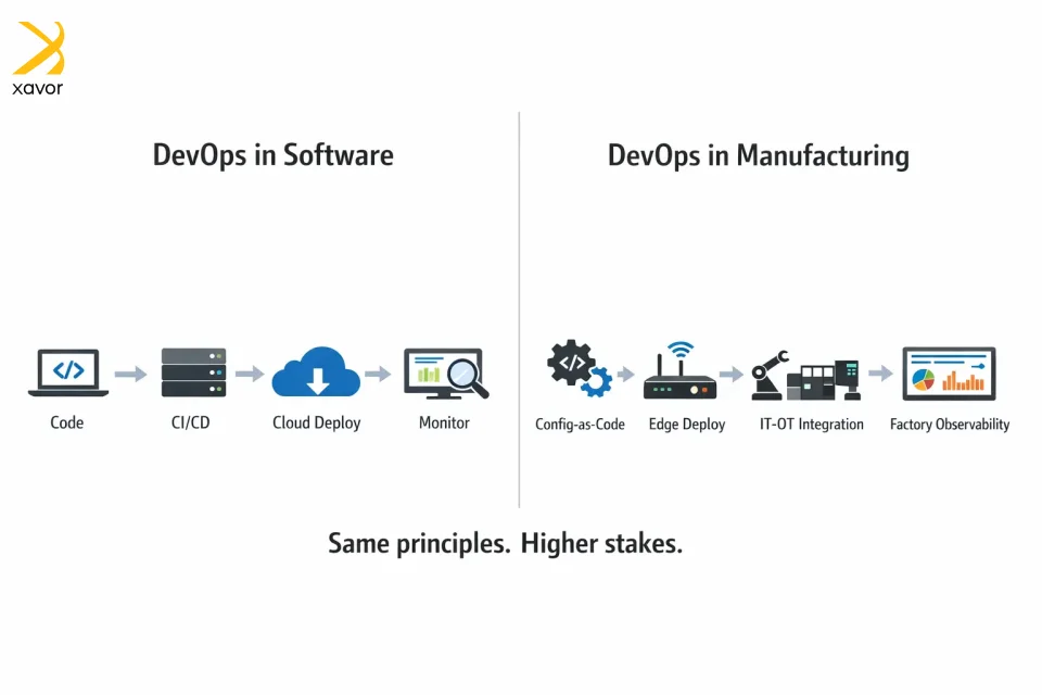 Gamyba remiasi programine įranga, skirta mašinoms, gamybos linijoms ir gamyklų sistemoms valdyti. „DevOps“ padeda komandoms saugiai pristatyti naujinimus ir greičiau išspręsti problemas, todėl sumažėja neplanuotų prastovų ir gamybos trikdžių.
