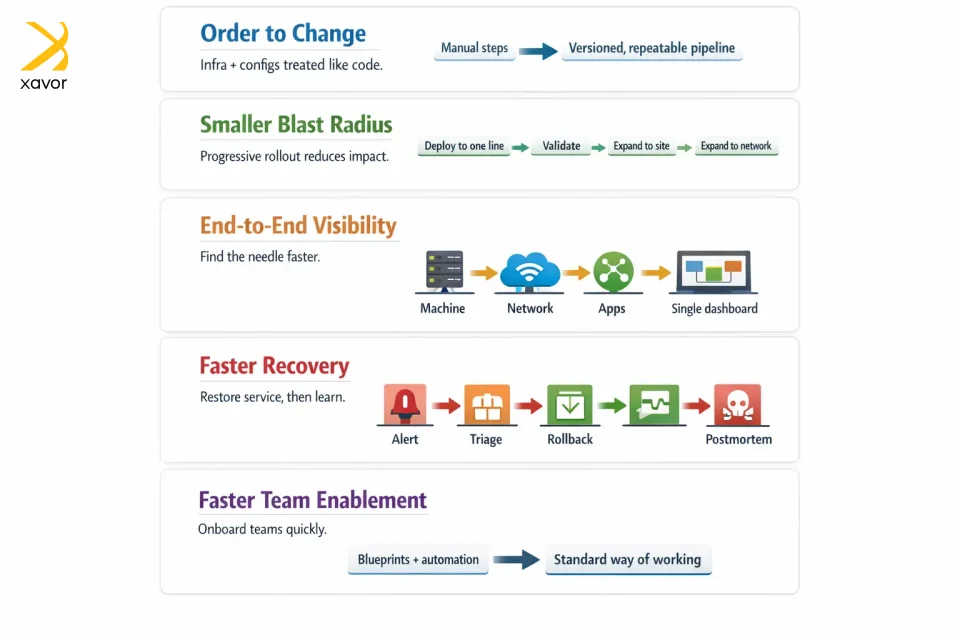 Dauguma IT prastovų pramoninėse situacijose atsiranda dėl nuspėjamų modelių: rankinio diegimo ir nenuoseklių konfigūracijų, kurios praslysta visiems. „DevOps“ diegimo paslaugos konvertuoja šiuos rankinius pakeitimus į kartojamas sistemas, pvz.: